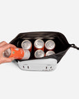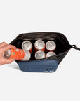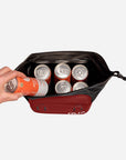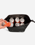 this cooler is the perfect size to hold a 6'er, small snacks, and ice pack. Love all the lash points which make it easy to tie on to whatever gear we are adventuring with. I really like the roll down top so we aren't dealing with a zipper getting rusty when we take it on the ocean. Wipes clean easy and looks cute