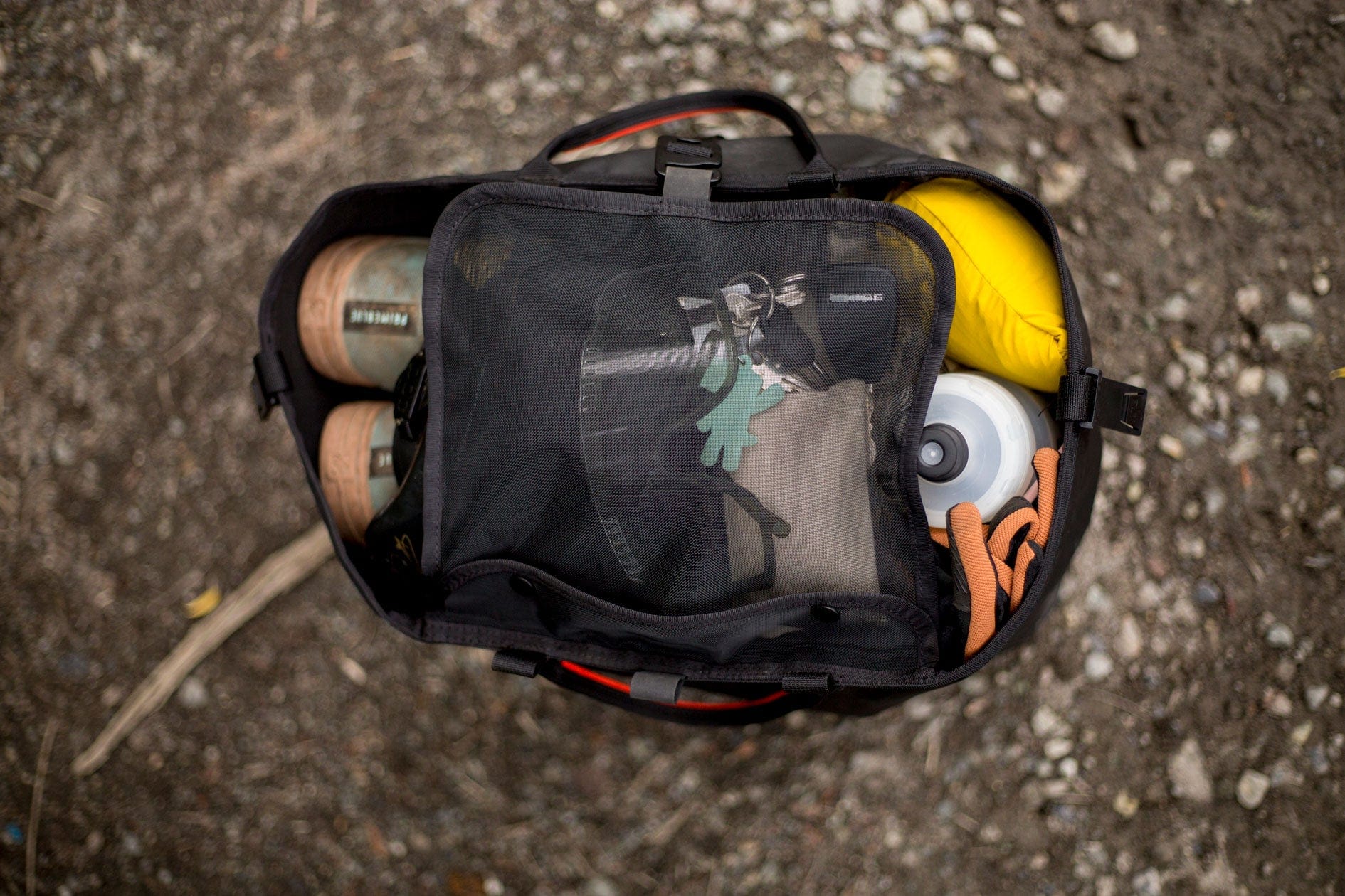 Perfect carry-all for mountain biking. Gear goes in the bag, tools and keys in the flap pocket, and it all cinches together nicely. The perfect gear grab and go.