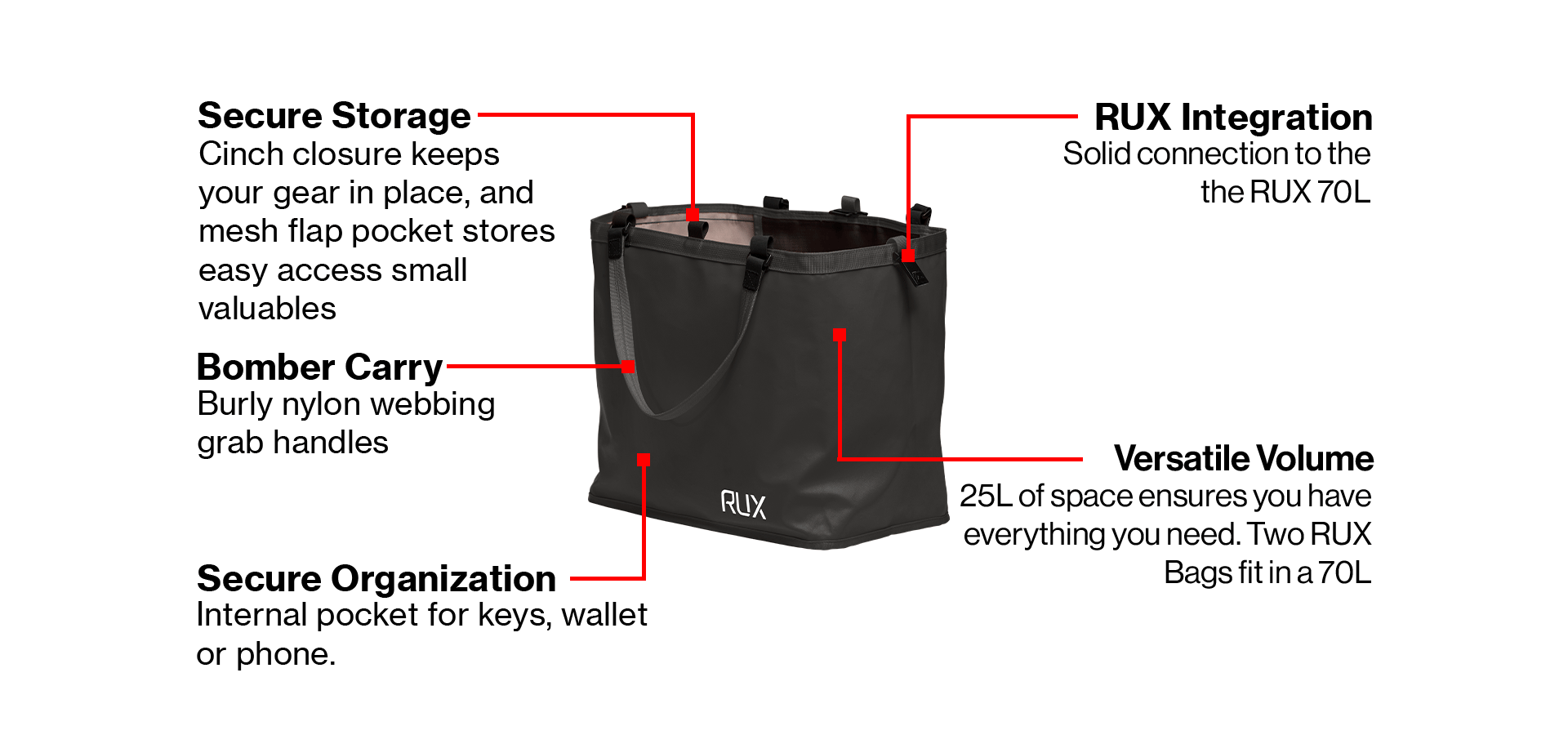 • RUX Connect buckles: Secure the Bag inside the RUX 70L.