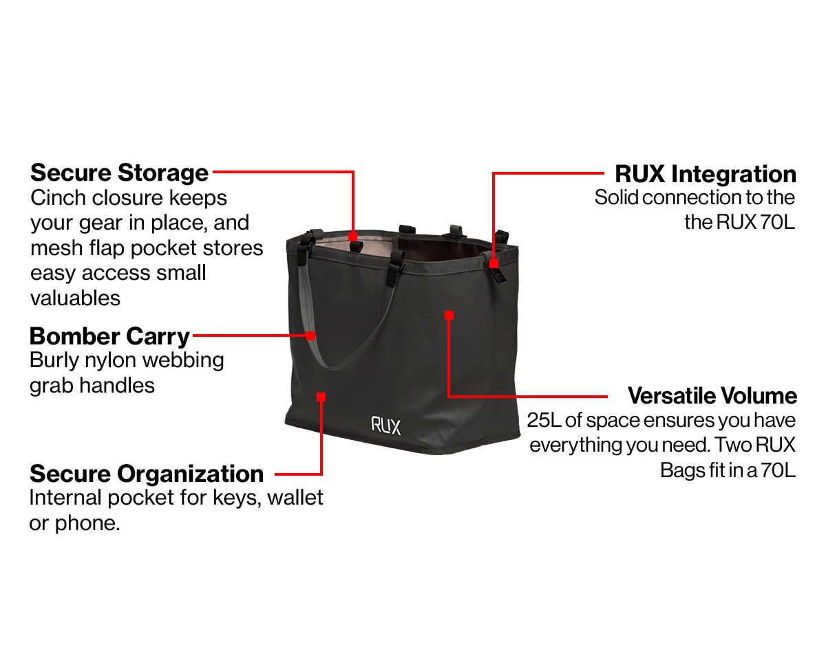 Versatile, easy to pack 'n grab 25L bag that nests inside the RUX 70L, conveniently dividing up your storage space. Incredibly handy for everyday use from the market to the campsite.