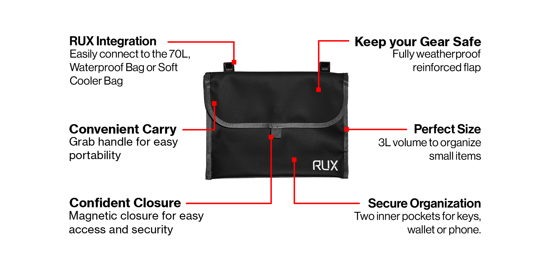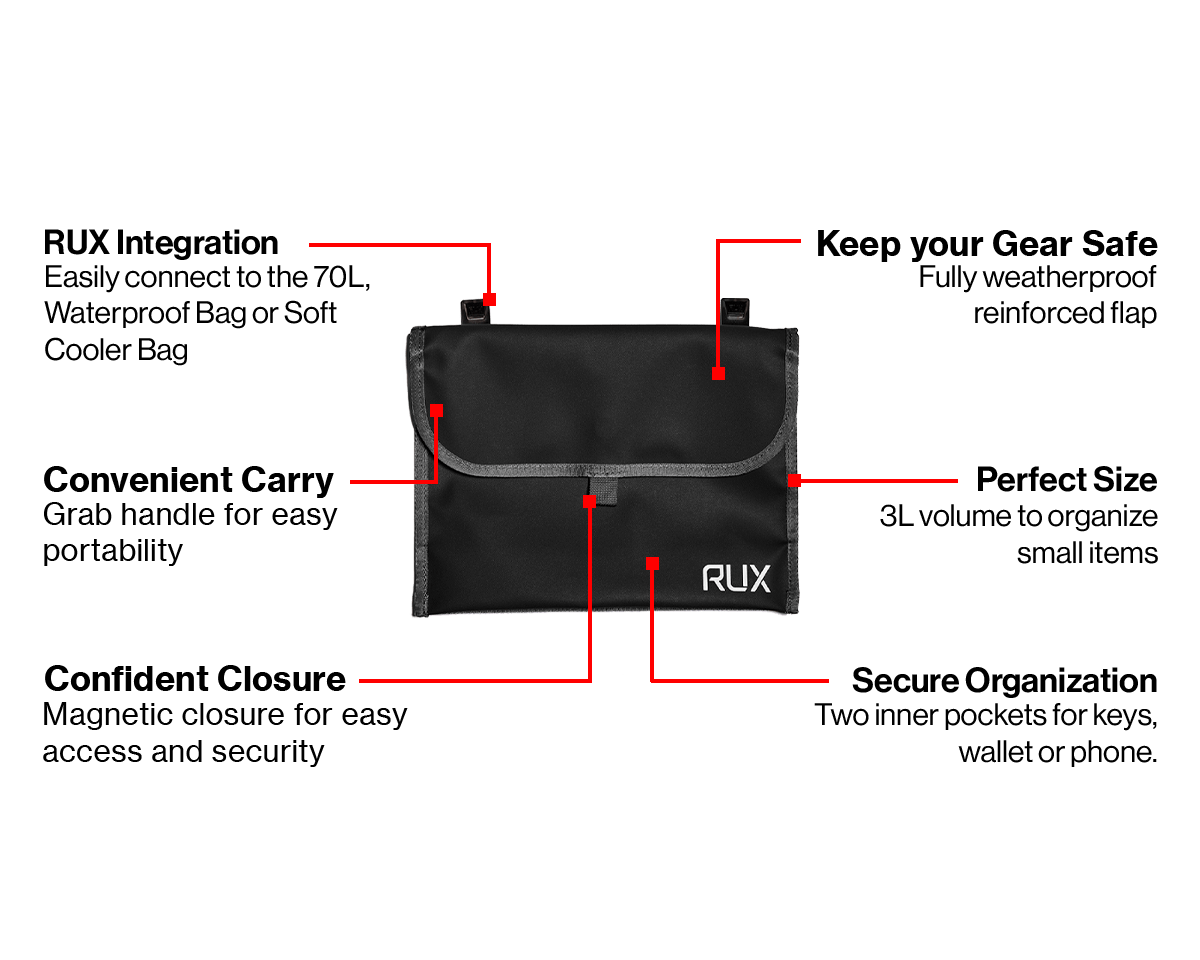 Part of the RUX gear management system, the rugged, weatherproof 3-litre RUX pocket is designed for valuables that need a convenient, secure and safe place to be stored and transported.