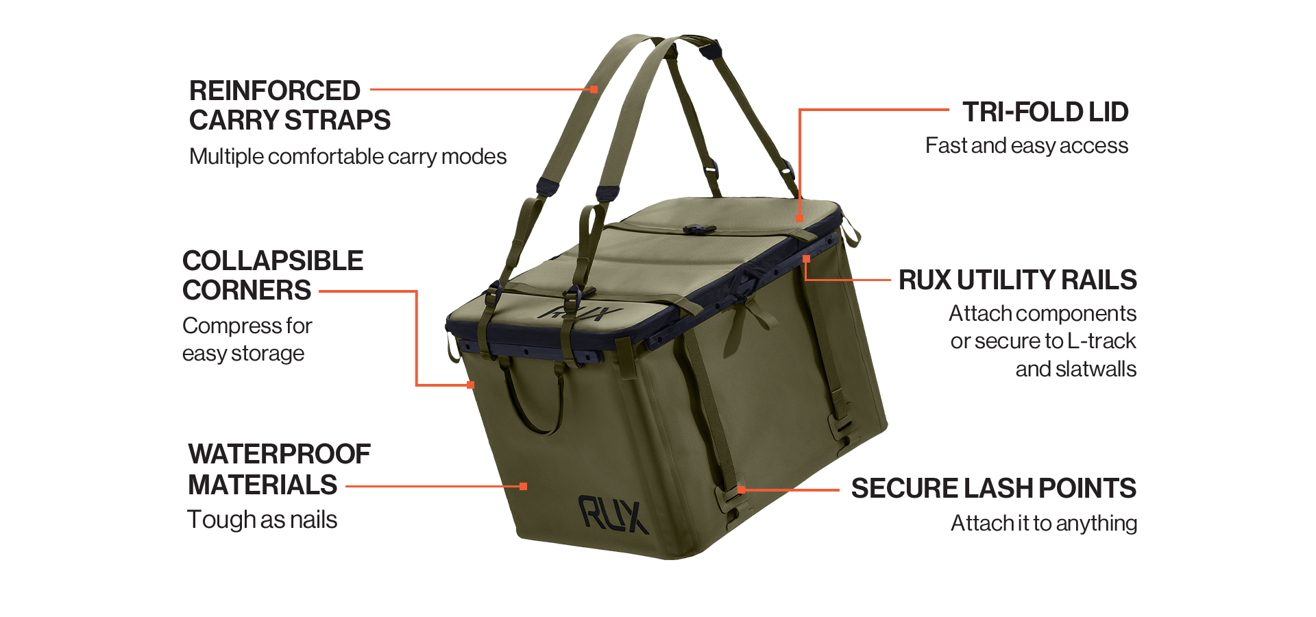 - Next Level Organization: RUX 70L is the original collapsible high-capacity gear hauler for hassle-free adventures in all conditions. THREE RUX 70L will take your gear organization to the next level!